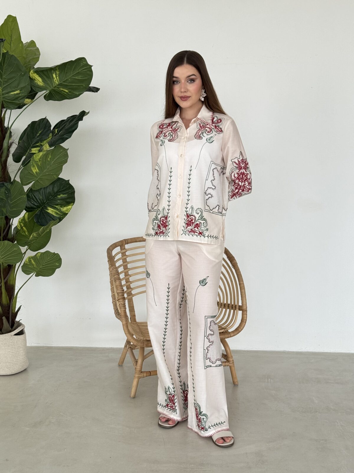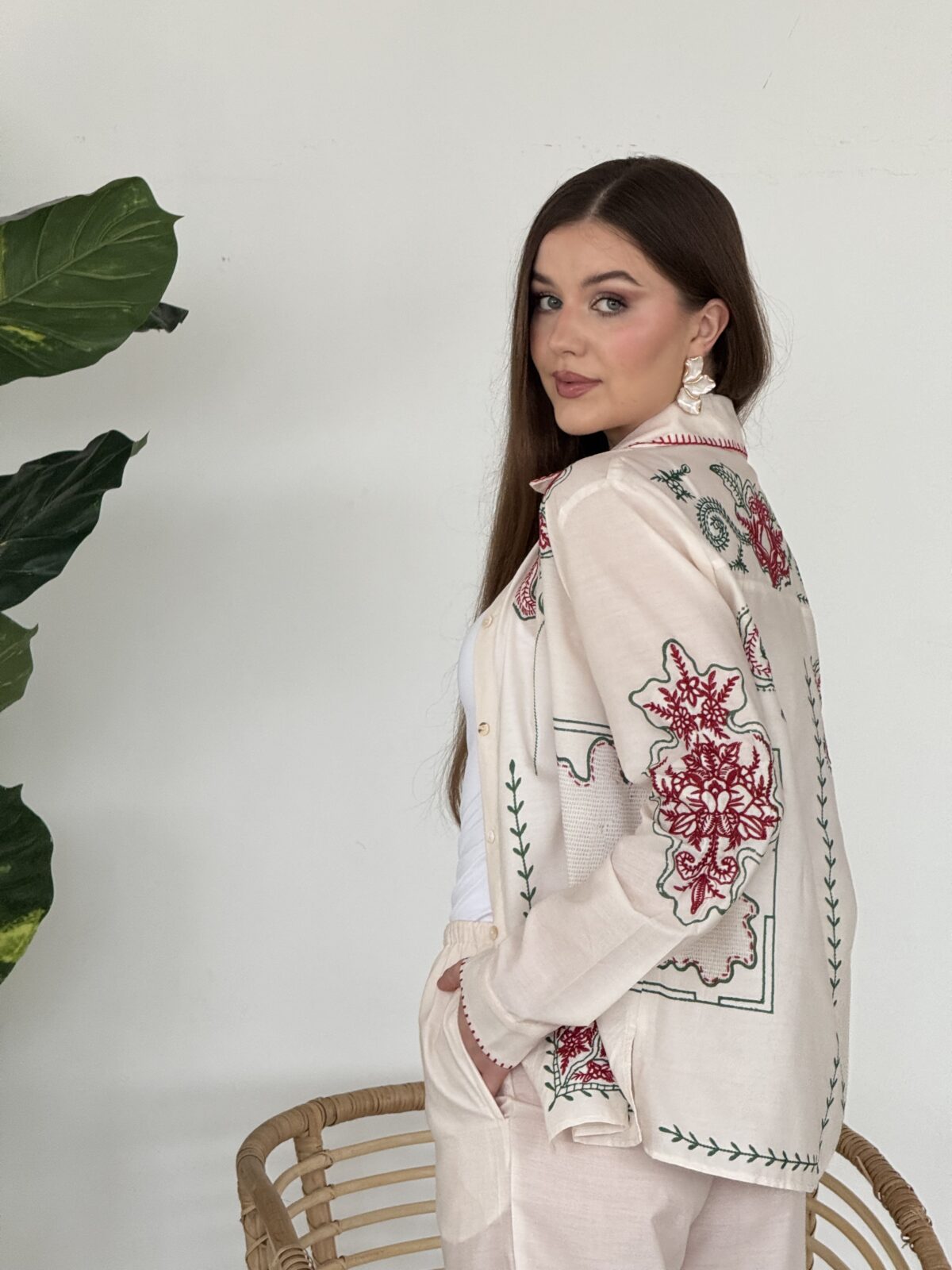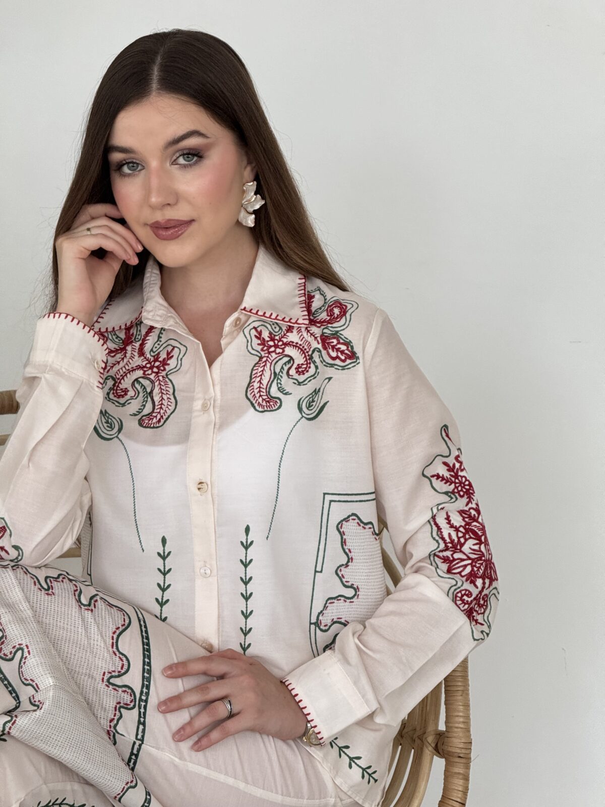 بدلة صيفية قطنية، مزينة بزخرفات خضراء و تطريزات حمراء فخمة...