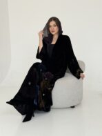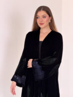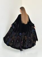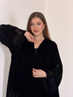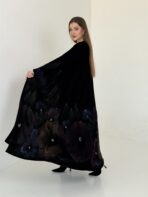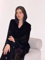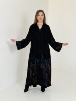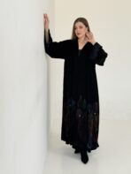 عباية مخمل سوداء فاخرة بحاشية فنية برسم يدوي من الورود بألوان جميلة تضيف للقطعة لمسة أنثوية