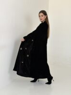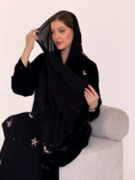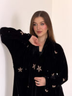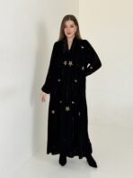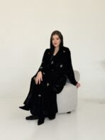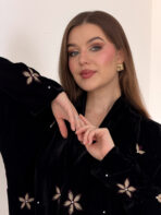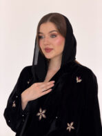 عباية مخمل سوداء بتطريزات موردة متناثرة و تفاصيل فاخرة تكمل حضورك و تمنحك بريقا" مختلفا"