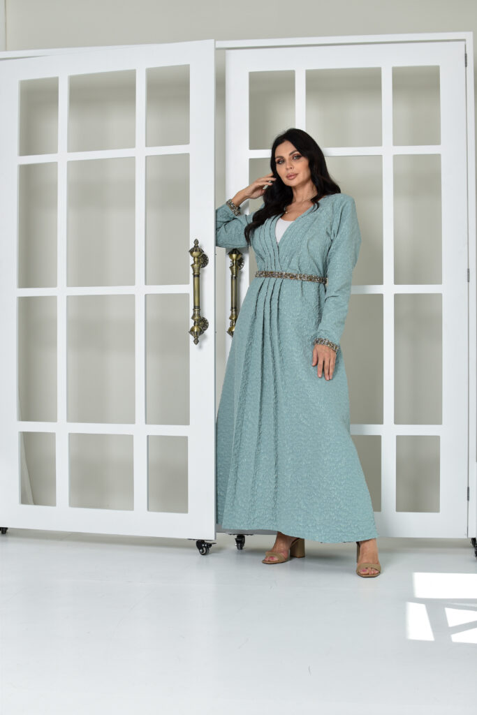 فستان طويل مصنوع من قماش الجاكار مع حزام.
