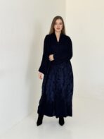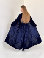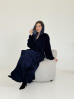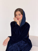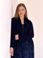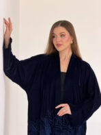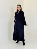 Luxurious navy blue velvet abaya embroidered with a unique artistic design that highlights the beauty of the velvet fabric.