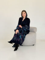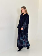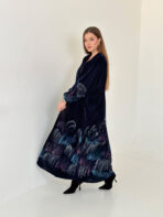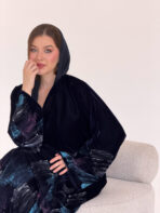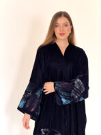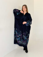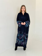 Navy blue velvet abaya with a hand-painted artistic border.. a design that combines luxury and distinction…